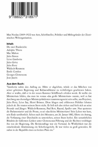 Max Nordau (1849-1923) war Arzt, Schriftsteller, Politiker und Mitbegründer der Zionistischen Weltorganisation. Inhalt: . Die zwei Frankreiche . Adolphe Thiers . Mac Mahon . Jules Simon . Léon Gambetta . Jules Grévy . Jules Ferry . Waldeck-Rousseau . Emile Combes . Georges Clemenceau . Jean Jaurès . Aus dem Buch: . "Gambetta nahm den Auftrag an. Hätte er abgelehnt, würde er das Märchen von seiner geheimen Regierung und Kulissendiktatur zu rechtfertigen geschienen haben. Aber er wußte, daß er in der neuen Kammer Schiffbruch erleiden werde. Er wollte ein Ministerium bilden, das man im voraus »das große Ministerium« nannte, weil es fast durchweg aus ehemaligen Ministerpräsidenten zusammengesetzt sein sollte, aus Freycinet, Jules Ferry, Léon Say, Henri Brisson. Diese klugen und erfahrenen Politiker lehnten jedoch ab. Sie trauten seinem Stern nicht. Er ließ sich also ziehen und hielt sich an seine Freunde und Jünger: Waldeck-Rousseau, Paul Bert, Raynal, Spuller usw. Nun spotteten die Parlamentarier und die Presse, es sei »das kleine Ministerium«! Sein Leben war kurz, sein Ende unrühmlich. Schon nach drei Monaten, am 26. Januar 1882, führte ein Antrag, die Verfassung einer Durchsicht zu unterziehen, seinen Sturz herbei. Ein unnatürliches Bündnis der äußersten Linken unter Clemenceaus Führung und der Rechten verdrängte ihn von der Regierung. Die Revisionsfrage war ein Vorwand. In Wirklichkeit war die entscheidende Abstimmung ein Scherbengericht. Er war vielen zu groß geworden. Er nahm in der Republik einen zu breiten Platz ein."