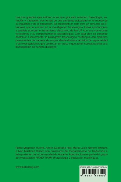 Los tres grandes ejes entorno a los que gira este volumen: fraseología, variación y traducción son temas de una candente actualidad en el mundo de la lingüística y de la traducción. Se presentan en esta obra un conjunto de 21 trabajos que se centran en la investigación fraseológica. Estas aportaciones y análisis abordan el tratamiento discursivo de las UF con sus numerosas variaciones y su comportamiento traductológico. Con esta obra se pretende contribuir a incrementar la bibliografía fraseológica multilingüe con ejemplos provenientes de trabajos de corpus desde diversos ámbitos de especialidad y de investigaciones que continúan en curso y que abren nuevas puertas a la investigación de nuestra disciplina.