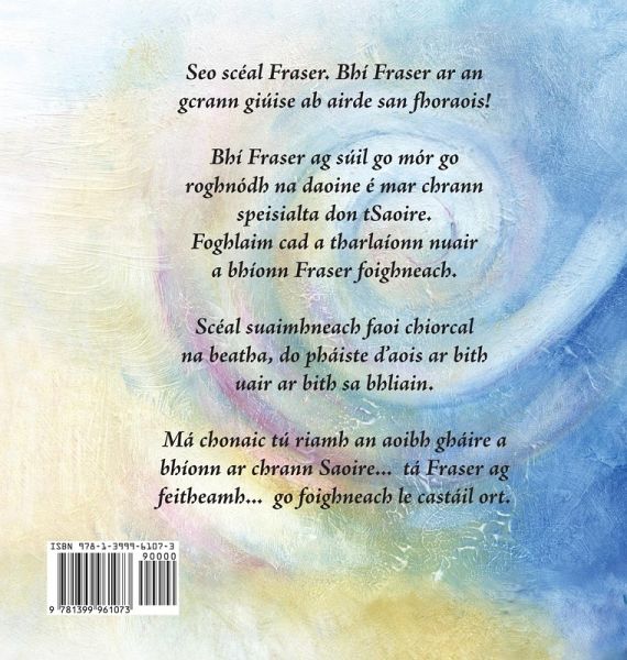 Seo scéal Fraser. Bhí Fraser ar an gcrann giúise ab airde san fhoraois! Bhí Fraser ag súil go mór go roghnódh na daoine é mar chrann speisialta don tSaoire. Foghlaim cad a tharlaíonn nuair a bhíonn Fraser foighneach. Scéal suaimhneach faoi chiorcal na beatha, do pháiste d'aois ar bith uair ar bith sa bhliain. Mura bhfaca tú riamh an aoibh gháire a bhíonn ar chrann Saoire, ... tá Fraser ag feitheamh go foighneach le castáil ort.