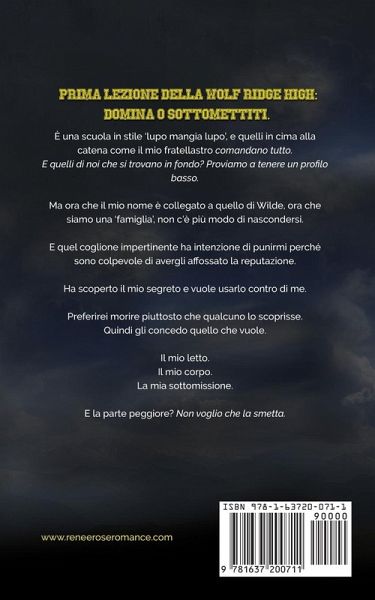Prima lezione della Wolf Ridge High: domina o sottomettiti. È una scuola in stile 'lupo mangia lupo', e quelli in cima alla catena come il mio fratellastro comandano tutto. E quelli di noi che si trovano in fondo? Proviamo a tenere un profilo basso. Ma ora che il mio nome è collegato a quello di Wilde, ora che siamo una 'famiglia', non c'è più modo di nascondersi. E quel coglione impertinente ha intenzione di punirmi Perché sono colpevole di avergli affossato la reputazione. Ha scoperto il mio segreto e vuole usarlo contro di me. Preferirei morire piuttosto che qualcuno lo scoprisse. Quindi gli concedo quello che vuole. Il mio letto. Il mio corpo. La mia sottomissione. E la parte peggiore? Non voglio che la smetta.