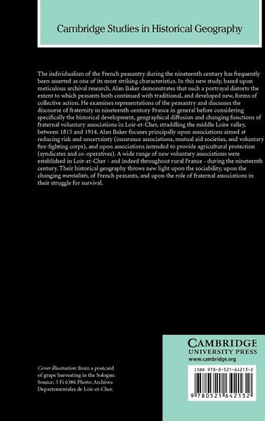 The individualism of the French peasantry during the nineteenth century has frequently been asserted as one of its most striking characteristics. In this 1999 book, Alan Baker challenges this orthodox view and demonstrates the extent to which peasants continued with traditional, and developed new, forms of collective action. He examines representations of the peasantry and discusses the discourse of fraternity in nineteenth-century France in general before considering specifically the historical development, geographical diffusion and changing functions of fraternal voluntary associations in Loir-et-Cher between 1815 and 1914. Alan Baker focuses principally upon associations aimed at reducing risk and uncertainty and upon associations intended to provide agricultural protection. A wide range of new voluntary associations were established in Loir-et-Cher - and indeed throughout rural France - during the nineteenth century. Their historical geography throws new light upon the sociability, upon the changing mentalités, of French peasants, and upon the role of fraternal associations in their struggle for survival.
