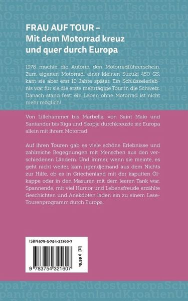 1978 machte die Autorin den Motorradführerschein. Zum eigenen Motorrad, einer kleinen Suzuki 450 GS, kam sie aber erst 10 Jahre später. Ein Schlüsselerlebnis war für sie die erste mehrtägige Tour in die Schweiz. Danach stand fest: ein Leben ohne Motorrad ist nicht mehr möglich! Von Lillehammer bis Marbella, von Saint Malo und Santander bis Riga und Skopje durchkreuzte sie Europa allein mit ihrem Motorrad. Auf ihren Touren gab es viele schöne Erlebnisse und zahlreiche Begegnungen mit Menschen aus den verschiedenen Ländern. Und immer, wenn sie meinte, es geht nicht weiter, kam irgendjemand aus dem Nichts zur Hilfe, ob es in Griechenland mit der kaputten Ölkappe oder in den Masuren mit dem leeren Tank war. Spannende, mit viel Humor und Lebensfreude erzählte Geschichten und Anekdoten laden ein zu einem Lese-Tourenprogramm durch Europa.