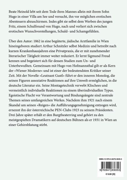 Arthur Schnitzler: Frau Beate und ihr Sohn Lesefreundlicher Großdruck in 16-pt-Schrift Beate Heinold lebt seit dem Tode ihres Mannes allein mit ihrem Sohn Hugo in einer Villa am See und versucht, ihn vor möglichen erotischen Abenteuern abzuschirmen. Indes gibt sie selbst dem Werben des jungen Fritz, einem Schulfreund von Hugo, nach und verliert sich zwischen erotischen Wunschvorstellungen, Schuld- und Schamgefühlen. Großformat, 210 x 297 mm Berliner Ausgabe, 2019 Durchgesehener Neusatz mit einer Biographie des Autors bearbeitet und eingerichtet von Theodor Borken Erstdruck: Die Neue Rundschau, XXIV. Jahrgang, 2.¿4. Heft, Februar ¿ April 1913. Textgrundlage ist die Ausgabe: Arthur Schnitzler: Gesammelte Werke. Die erzählenden Schriften, 2 Bände, Frankfurt a.M.: S. Fischer Verlag, 1961. Umschlaggestaltung von Thomas Schultz-Overhage unter Verwendung des Bildes: Carl Larsson, Hakon, Daga und Edgar (Ausschnitt), 1902.. Gesetzt aus der Minion Pro, 16 pt. Henricus Edition Deutsche Klassik UG (haftungsbeschränkt) Über den Autor: 1862 in eine begüterte, jüdische Arztfamilie in Wien hineingeboren studiert Arthur Schnitzler selbst Medizin und betreibt nach kurzen Krankenhausjahren eine Privatpraxis, die er mit zunehmender literarischer Tätigkeit immer weiter reduziert. Er lernt Sigmund Freud kennen und begeistert sich für dessen Studien zum Un- und Unterbewußten. Gemeinsam mit Hugo von Hofmannsthal gilt er als Kern der »Wiener Moderne« und ist einer der bedeutendsten Kritiker seiner Zeit. Mit der Novelle »Leutnant Gustl« führt er den inneren Monolog, die seinen Figuren assoziative Reaktionen auf ihre Umwelt ermöglichen, in die deutsche Literatur ein. Seine Montagetechnik verwebt Klischees und vermeintlich individuelle Reaktionen zu einem überindividuellen Typus. Egoistische Flucht vor Verantwortung und Bindungsängste sind zentrale Themen seines umfangreichen Werkes. Nachdem ihm 1921 nach einem Skandal um seinen »Reigen« die Aufführungsgenehmigung entzogen wird, ernennt ihn der österreichische PEN-Clubs 1923 zu seinem Präsidenten. Drei Jahre später erhält er den Burgtheaterring und gehört zu den meistgespielten Dramatikern auf deutschen Bühnen als er 1931 in Wien an einer Gehirnblutung stirbt.