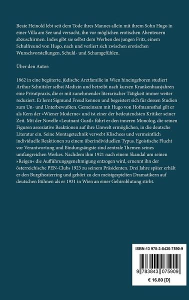 Arthur Schnitzler: Frau Beate und ihr Sohn Beate Heinold lebt seit dem Tode ihres Mannes allein mit ihrem Sohn Hugo in einer Villa am See und versucht, ihn vor möglichen erotischen Abenteuern abzuschirmen. Indes gibt sie selbst dem Werben des jungen Fritz, einem Schulfreund von Hugo, nach und verliert sich zwischen erotischen Wunschvorstellungen, Schuld- und Schamgefühlen. Erstdruck: Die Neue Rundschau, XXIV. Jahrgang, 2.¿4. Heft, Februar ¿ April 1913. Vollständige Neuausgabe mit einer Biographie des Autors. Herausgegeben von Karl-Maria Guth. Berlin 2015. Textgrundlage ist die Ausgabe: Arthur Schnitzler: Gesammelte Werke. Die erzählenden Schriften, 2 Bände, Frankfurt a.M.: S. Fischer Verlag, 1961. Die Paginierung obiger Ausgabe wird in dieser Neuausgabe als Marginalie zeilengenau mitgeführt. Umschlaggestaltung von Thomas Schultz-Overhage unter Verwendung des Bildes: Carl Larsson, Hakon, Daga und Edgar (Ausschnitt), 1902.. Gesetzt aus Minion Pro, 11 pt. Über den Autor: 1862 in eine begüterte, jüdische Arztfamilie in Wien hineingeboren studiert Arthur Schnitzler selbst Medizin und betreibt nach kurzen Krankenhausjahren eine Privatpraxis, die er mit zunehmender literarischer Tätigkeit immer weiter reduziert. Er lernt Sigmund Freud kennen und begeistert sich für dessen Studien zum Un- und Unterbewußten. Gemeinsam mit Hugo von Hofmannsthal gilt er als Kern der »Wiener Moderne« und ist einer der bedeutendsten Kritiker seiner Zeit. Mit der Novelle »Leutnant Gustl« führt er den inneren Monolog, die seinen Figuren assoziative Reaktionen auf ihre Umwelt ermöglichen, in die deutsche Literatur ein. Seine Montagetechnik verwebt Klischees und vermeintlich individuelle Reaktionen zu einem überindividuellen Typus. Egoistische Flucht vor Verantwortung und Bindungsängste sind zentrale Themen seines umfangreichen Werkes. Nachdem ihm 1921 nach einem Skandal um seinen »Reigen« die Aufführungsgenehmigung entzogen wird, ernennt ihn der österreichische PEN-Clubs 1923 zu seinem Präsidenten. Drei Jahre später erhält er den Burgtheaterring und gehört zu den meistgespielten Dramatikern auf deutschen Bühnen als er 1931 in Wien an einer Gehirnblutung stirbt.