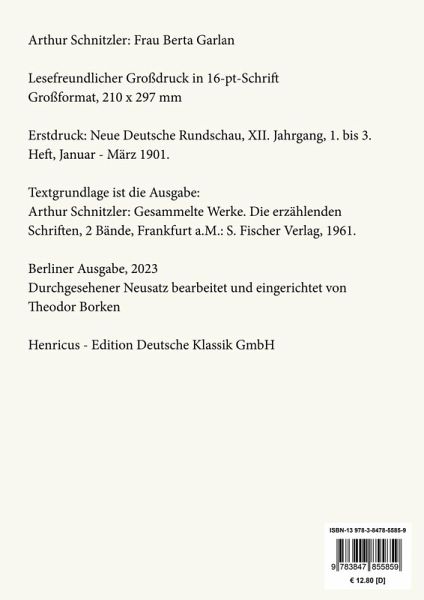 Arthur Schnitzler: Frau Berta GarlanLesefreundlicher Großdruck in 16-pt-SchriftGroßformat, 210 x 297 mmBerliner Ausgabe, 2023Durchgesehener Neusatz bearbeitet und eingerichtet von Theodor BorkenErstdruck: Neue Deutsche Rundschau, XII. Jahrgang, 1. bis 3. Heft, Januar - März 1901.Textgrundlage ist die Ausgabe:Arthur Schnitzler: Gesammelte Werke. Die erzählenden Schriften, 2 Bände, Frankfurt a.M.: S. Fischer Verlag, 1961.Umschlagabbildung: Alphonse Mucha, Portrait von Jaroslava, 1930Gesetzt aus der Minion Pro, 16 pt.Henricus - Edition Deutsche Klassik GmbHÜber den Autor:1862 in eine begüterte jüdische Arztfamilie in Wien hineingeboren studiert Arthur Schnitzler selbst Medizin und betreibt nach kurzen Krankenhausjahren eine Privatpraxis, die er mit zunehmender literarischer Tätigkeit immer weiter reduziert. Er lernt Sigmund Freud kennen und begeistert sich für dessen Studien zum Un- und Unterbewussten. Gemeinsam mit Hugo von Hofmannsthal gilt er als Kern der »Wiener Moderne« und isteiner der bedeutendsten Kritiker seiner Zeit. Mit der Novelle »Leutnant Gustl« führt er den inneren Monolog, die seinen Figuren assoziative Reaktionen auf ihre Umwelt ermöglichen, in die deutsche Literatur ein. Seine Montagetechnik verwebt Klischees und vermeintlich individuelle Reaktionen zu einem überindividuellen Typus. Egoistische Flucht vor Verantwortung und Bindungsängste sind zentrale Themen seines umfangreichen Werkes. Nachdem ihm 1921 nach einem Skandal um seinen »Reigen« die Aufführungsgenehmigung entzogen wird, ernennt ihn der österreichische PEN-Club 1923 zu seinem Präsidenten. Drei Jahre später erhält er den Burgtheaterring und gehört zu den meistgespielten Dramatikern auf deutschen Bühnen, als er 1931 in Wien an einer Gehirnblutung stirbt.