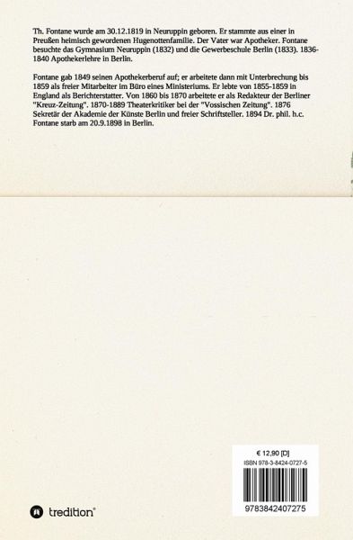 Th. Fontane wurde am 30.12.1819 in Neuruppin geboren. Er stammte aus einer in Preußen heimisch gewordenen Hugenottenfamilie. Der Vater war Apotheker. Fontane besuchte das Gymnasium Neuruppin (1832) und die Gewerbeschule Berlin (1833). 1836-1840 Apothekerlehre in Berlin.Fontane gab 1849 seinen Apothekerberuf auf; er arbeitete dann mit Unterbrechung bis 1859 als freier Mitarbeiter im Büro eines Ministeriums. Er lebte von 1855-1859 in England als Berichterstatter. Von 1860 bis 1870 arbeitete er als Redakteur der Berliner "Kreuz-Zeitung". 1870-1889 Theaterkritiker bei der "Vossischen Zeitung". 1876 Sekretär der Akademie der Künste Berlin und freier Schriftsteller. 1894 Dr. phil. h.c. Fontane starb am 20.9.1898 in Berlin.