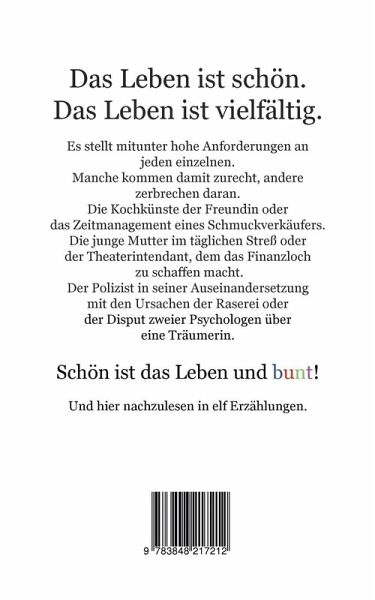 Das Leben ist schön. Das Leben ist vielfältig. Es stellt mitunter hohe Anforderungen an jeden einzelnen. Manche kommen damit zurecht, andere zerbrechen daran.Die Kochkünste der Freundin oder das Zeitmanagement eines Schmuckverkäufers. Die junge Mutter im täglichen Stress oder der Theaterintendant, dem das Finanzloch zu schaffen macht. Der Polizist in seiner Auseinandersetzung mit den Ursachen der Raserei oder der Disput zweier Psychologen über eine Träumerin.Schön ist das Leben und bunt! Und hier zu lesen in elf Erzählungen.