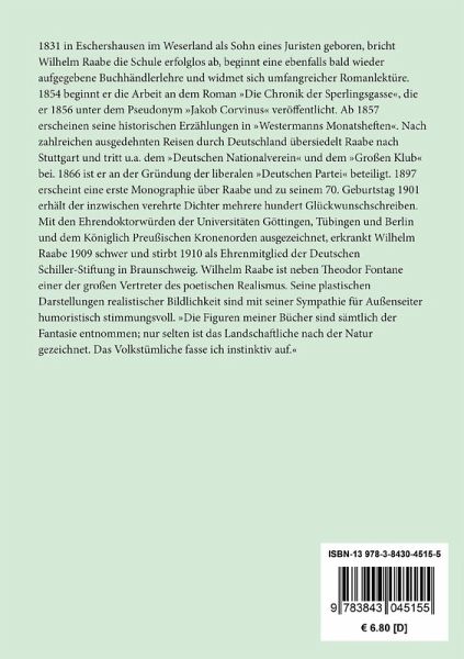 Wilhelm Raabe: Frau Salome Entstanden 1874/75. Erstdruck in: Westermann's Monatsheften (Braunschweig), Februar 1875. Vollständige Neuausgabe mit einer Biographie des Autors. Herausgegeben von Karl-Maria Guth. Berlin 2015. Textgrundlage ist die Ausgabe: Wilhelm Raabe: Ausgewählte Werke in sechs Bänden. Herausgegeben von Peter Goldammer und Helmut Richter, Berlin und Weimar: Aufbau, 1964¿1966. Die Paginierung obiger Ausgabe wird in dieser Neuausgabe als Marginalie zeilengenau mitgeführt. Umschlaggestaltung von Thomas Schultz-Overhage unter Verwendung des Bildes: Alexandre Cabanel, Gräfin von Keller, 1873. Gesetzt aus Minion Pro, 11 pt. Über den Autor: 1831 in Eschershausen im Weserland als Sohn eines Juristen geboren, bricht Wilhelm Raabe die Schule erfolglos ab, beginnt eine ebenfalls bald wieder aufgegebene Buchhändlerlehre und widmet sich umfangreicher Romanlektüre. 1854 beginnt er die Arbeit an dem Roman »Die Chronik der Sperlingsgasse«, die er 1856 unter dem Pseudonym »Jakob Corvinus« veröffentlicht. Ab 1857 erscheinen seine historischen Erzählungen in »Westermanns Monatsheften«. Nach zahlreichen ausgedehnten Reisen durch Deutschland übersiedelt Raabe nach Stuttgart und tritt u.a. dem »Deutschen Nationalverein« und dem »Großen Klub« bei. 1866 ist er an der Gründung der liberalen »Deutschen Partei« beteiligt. 1897 erscheint eine erste Monographie über Raabe und zu seinem 70. Geburtstag 1901 erhält der inzwischen verehrte Dichter mehrere hundert Glückwunschschreiben. Mit den Ehrendoktorwürden der Universitäten Göttingen, Tübingen und Berlin und dem Königlich Preußischen Kronenorden ausgezeichnet, erkrankt Wilhelm Raabe 1909 schwer und stirbt 1910 als Ehrenmitglied der Deutschen Schiller-Stiftung in Braunschweig. Wilhelm Raabe ist neben Theodor Fontane einer der großen Vertreter des poetischen Realismus. Seine plastischen Darstellungen realistischer Bildlichkeit sind mit seiner Sympathie für Außenseiter humoristisch stimmungsvoll. »Die Figuren meiner Bücher sind sämtlich der Fantasie entnommen; nur selten ist das Landschaftliche nach der Natur gezeichnet. Das Volkstümliche fasse ich instinktiv auf.«