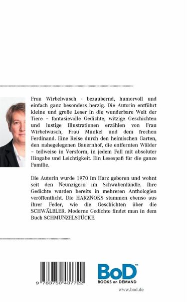 Frau Wirbelwusch. Bezaubernd, humorvoll und einfach ganz besonders herzig, genau das ist der kleine Marienkäfer, die Hauptperson des Buches.Die Autorin entführt kleine und große Leser in die wunderbare Welt der Tiere. Fantasievolle Gedichte, witzige Geschichten und lustige Illustrationen erzählen von Frau Wirbelwusch, Frau Munkel und dem frechen Ferdinand. Eine Reise durch den heimischen Garten, den nahegelegenen Bauernhof und die entfernten Wälder. Teilweise in Versform, in jedem Fall mit absoluter Hingabe und Leichtigkeit. Ein Lesespaß für die ganze Familie. Die Autorin wurde 1970 im Harz geboren und wohnt seit den Neunzigern im Schwabenländle. Ihre Gedichte wurden bereits in mehreren Anthologien veröffentlicht. Die HARZNOKS stammen ebenso aus ihrer Feder, wie die Geschichten über die SCHWÄLBLER. Moderne Alltagsgedichte sind in dem Buch SCHMUNZELSTÜCKE zu finden.