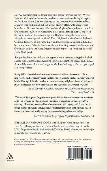 In 1922, Adolphe Shrager having made his fortune during the First World War, approached the London dealer Basil Dighton for advice on purchasing antique furniture. Dighton sold him about five hundred items but shortly afterwards Shrager discovered that one of his 'collector's pieces' was judged to be a fake and grossly over-priced, and he sued. The trial, held in early 1923, became a cause celebre, but it can be viewed as a case study of a much wider set of social and cultural concerns: the fact that Shrager lost both the first trial and the appeal, despite demonstrating on numerous occasions that he had a clear case against Dighton, raises questions of race, prejudice and class, where the establishment closed ranks against Shrager, the nouveau riche Jew and alleged war profiteer. This book - the first on the Shrager Dighton case - is the result of the author's original archival research.