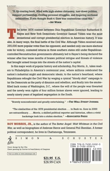 The bitter 1876 contest between Ohio Republican Governor Rutherford B. Hayes and New York Democratic Governor Samuel Tilden was the most sensational and corrupt presidential election in American history. It was also, in many ways, the final battle of the Civil War. Although Tilden received some 265,000 more popular votes than his opponent, and needed only one more electoral vote for victory, contested returns in three southern states still under Republican-controlled Reconstruction governments ultimately led to Hayes's being declared the winner after four tense months of brazen political intrigue and threats of violence that brought armed troops into the streets of the nation's capital. In this major work of popular history and scholarship, Roy Morris, Jr., takes readers to Philadelphia in America's centennial year, where millions celebrated the nation's industrial might and democratic ideals; to the nation's heartland, where Republicans refought the Civil War by waging a cynical "bloody shirt" campaign to tar the Democrats as the party of disunion and rebellion; and finally into the smoke-filled back rooms of Washington, D.C., where the will of the people was thwarted and the newly won rights of four million former slaves were ignored, leading to nearly ninety years of legalized segregation in the South.