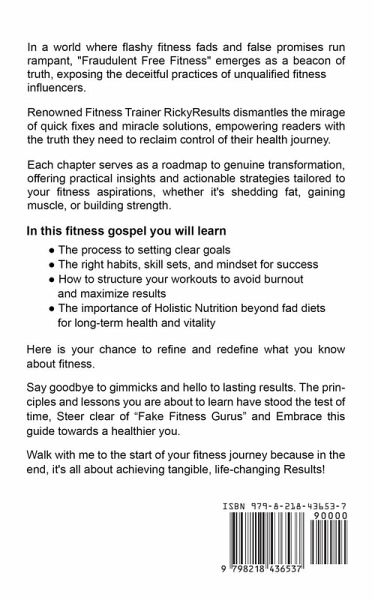In a world where Flashy Fitness Fads and false promises run rampant, "Fraudulent Free Fitness" emerges as a beacon of truth, exposing the deceitful practices of unqualified fitness influencers. Renowned Fitness Trainer RickyResults dismantles the mirage of quick fixes and miracle solutions, empowering readers with the truth they need to reclaim control of their health journey. Each chapter serves as a roadmap to genuine transformation, offering practical insights and actionable strategies tailored to your fitness aspirations, whether it's shedding fat, gaining muscle, or building strength. In this fitness gospel you will learn The process to setting clear goals The right habits, skill sets, and mindset for success How to structure your workouts to avoid burnout and maximize results The importance of Holistic Nutrition beyond fad diets for long-term health and vitality Here is your chance to refine and redefine what you know about fitness.Say goodbye to gimmicks and hello to lasting results.The principles and lessons you are about to learn have stood the test of time, Steer clear of "Fake Fitness Gurus" and Embrace this guide towards a healthier you. walk with me to the start of your fitness journey because in the end, it's all about achieving tangible, life-changing Results!