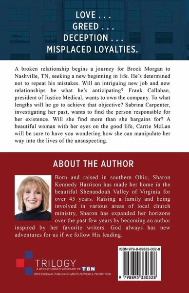 LOVE... GREED... DECEPTION... MISPLACED LOYALTIES. A broken relationship begins a journey for Brock Morgan to Nashville, TN, seeking a new beginning in life. He's determined not to repeat his mistakes. Will an intriguing new job and new relationships be what he's anticipating? Frank Callahan, president of Justice Medical, wants to own the company. to what lengths will he go to achieve that objective? Sabrina Carpenter, investigating her past, wants to find the person responsible for her existence. Will she find more than she bargains for? A beautiful woman with her eyes on the good life, Carrie McLan will be sure to have you wondering how she can manipulate her way into the lives of the unsuspecting.