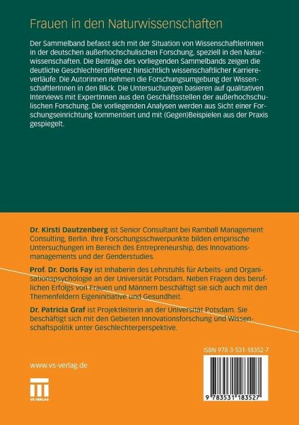 Der Sammelband befasst sich mit der Situation von Wissenschaftlerinnen in der deutschen außerhochschulischen Forschung, speziell in den Naturwissenschaften. Die Beiträge des vorliegenden Sammelbands zeigen die deutliche Geschlechterdifferenz hinsichtlich wissenschaftlicher Karriereverläufe. Die Autorinnen nehmen die Forschungsumgebung der WissenschaftlerInnen in den Blick. Die Untersuchungen basieren auf qualitativen Interviews mit ExpertInnen aus den Geschäftsstellen der außerhochschulischen Forschung. Die vorliegenden Analysen werden aus Sicht einer Forschungseinrichtung kommentiert und mit (Gegen)Beispielen aus der Praxis gespiegelt.