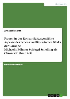 Unterrichtsentwurf aus dem Jahr 2010 im Fachbereich Didaktik - Germanistik, Note: 14 Punkte, Schulamt Jena/Stadtroda, Jena (Staatliches Schulamt in Thüringen), Sprache: Deutsch, Abstract: Inhaltsverzeichnis: Ausführlicher Unterrichtsentwurf zu den Punkten1. Bedingungsanalyse1.1 Charakterisierung der Lerngruppe und Schlussfolgerungen für die Unterrichtsgestaltung1.2 Lehrer-Schüler-Verhältnis1.3 Äußere Bedingungen2. Didaktisch-methodische Überlegungen und Begründungen2.1 Stellung der Stunde in der Stoffeinheit2.2 Sachanalyse sowie Auswahl und Begründung der Inhalte2.3 Auswahl und Begründung der Lernziele2.4 Begründung der didaktischen Stufung des Unterrichts und des gewählten Methodenkonzeptes2.5 Aussagen zu Schülerleistungen3. Verlaufsplanung4. Literaturverzeichnis5. Anhang (sehr umfangreiches, erprobtes und anwendungsbereites Material: Vorwort/ Hörsequenz/ Impuls, Arbeitsaufträge und Informationen zur Durchführung der Gruppenarbeit, Textmaterial der Gruppen: Gruppe 1 - "Gesellschaftliche Stellung im und Teilhabe der Frau am privaten und öffentlichen Leben des ausgehenden 18. Jahrhunderts - Briefkultur und Geselligkeit sowie Rolle der Frau und deren Bezüge zur Briefkultur"/ Textmaterial Gruppe 2 - "Leben und Werk der Caroline - Gegenstände, Motive und Inhalte ihres Schreibens" / Textmaterial Gruppe 3 - "Leben und Werk der Caroline - Ästhetischer Charakter ihres Briefwerks, Schlussbetrachtungen und weiterreichende Ausblicke", Literaturverzeichnis für Schüler, Exzerpte der Themengruppen (Erwartungsbilder zu den Ergebnissen der Gruppenarbeiten, Impulse) und Thesenpapier, Präsentations- und Bewertungskriterien für das Gruppenreferat sowie Didaktische Reserve)Die profunde Tiefgründigkeit und Ausführlichkeit des Entwurfes wurden im anschließenden Auswertungsgespräch besonders hervorgehoben. Die Arbeit enthält darüber hinaus aufwendig konzipiertes und anwendungsbereites Material im Anhang, das wiederum für den unmittelbaren Einsatz im Unterricht aufbereitet ist. Ferner inkludiert die Arbeit einen kompletten und in der Praxis erprobten Vorschlag (= Stoffverteilungsplan) für die Durchführung einer Unterrichtsreihe zur Epoche der "Romantik" in der Oberstufe.