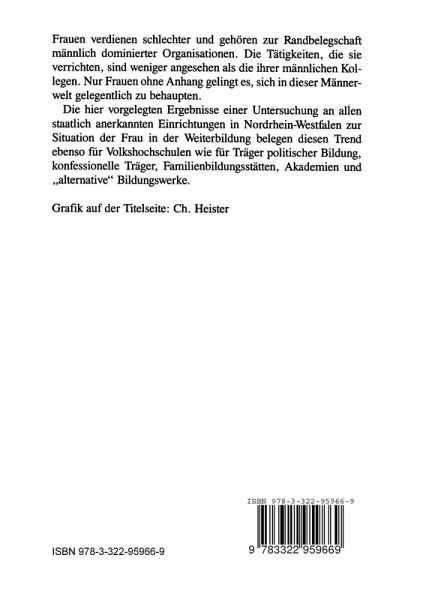 1. Frauen und Arbeit: Wo liegt das Problem für die Weiterbildung?.- 1.1 Frauenarbeit und Weiterbildung.- 1.2 Arbeitsplatz Weiterbildung.- 1.3 Selbstbilder der MitarbeiterInnen in der Weiterbildung: Träger der Weiterbildung.- 1.4 MitarbeiterInnen in der Weiterbildung.- 1.5 Frauen und Männer in der Weiterbildung: Zusammenfassung.- 2. Die empirische Untersuchung und die Darstellung ihrer Ergebnisse.- 2.1 Zur Methode der empirischen Erhebung.- 2.2 Datenschutz.- 2.3 Danksagung.- 2.4 Darstellung der Analyseergebnisse.- 3. Hauptgesichtspunkte der empirischen Erhebung.- 3.1 Anzahl der Weiterbildungseinrichtungen.- 3.2 Größe der Weiterbildungseinrichtungen.- 3.3 Aufgaben der Weiterbildungseinrichtungen.- 3.4 Institutionelle Qualifikationen des Personals.- 3.5 Soziale Qualifikationen der Beschäftigten.- 3.6 Maßnahmen für mehr Gleichberechtigung.- 3.7 Spezielle Bildungsangebote und Gleichberechtigung.- 3.8 Weiterbildung als Männerdomäne: Zusammenfassung.- 4. Repräsentativität und Aussagekraft der Untersuchung.- 5. Geschichtliche Entwicklung der Weiterbildung.- 6. Frauen und Männer als Personal in der Weiterbildung.- 6.1 MitarbeiterInnen in den Einrichtungen der Weiterbildung.- 6.2 Berufliche und soziale Qualifikationen und soziale Lage der MitarbeiterInnen.- 6.3 Frauen und Männer in der Leitung.- 6.4 Frauen und Männer im Vorstand.- 7. Frauenförderung.- 8. Bildungsurlaub für Frauen und Männer.- 8.1 Bildungsurlaubsveranstaltungen.- 8.2 Präferenzen der Wahrnehmung von Bildungsurlaubveranstaltungen bei Frauen.- 9. Frauen als Personal in der Männerdomäne Weiterbildung.