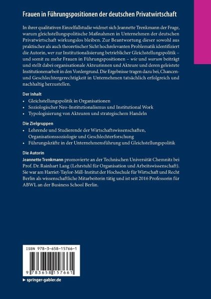 In ihrer qualitativen Einzelfallstudie widmet sich Jeannette Trenkmann der Frage, warum gleichstellungspolitische Maßnahmen in Unternehmen der deutschen Privatwirtschaft wirkungslos bleiben. Zur Beantwortung dieser sowohl aus praktischer als auch theoretischer Sicht hochrelevanten Problematik identifiziert die Autorin, wer zur Institutionalisierung betrieblicher Gleichstellungspolitik - und somit zu mehr Frauen in Führungspositionen - wie und warum beiträgt und stellt dabei organisationale Akteurinnen und Akteure und deren geleistete Institutionenarbeit in den Vordergrund. Die Ergebnisse tragen dazu bei, Chancen- und Geschlechtergerechtigkeit in Unternehmen tatsächlich erfolgreich und nachhaltig herzustellen.