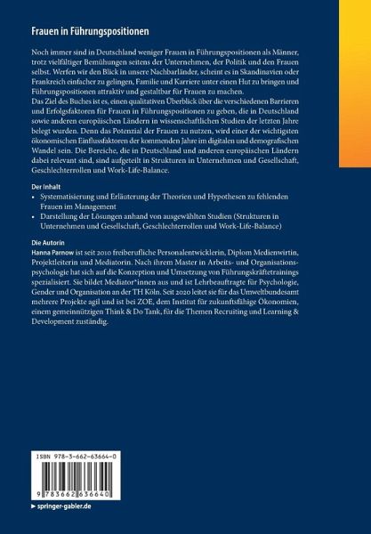 Noch immer sind in Deutschland weniger Frauen in Führungspositionen als Männer, trotz vielfältiger Bemühungen seitens der Unternehmen, der Politik und den Frauen selbst. Werfen wir den Blick in unsere Nachbarländer, scheint es in Skandinavien oder Frankreich einfacher zu gelingen, Familie und Karriere unter einen Hut zu bringen und Führungspositionen attraktiv und gestaltbar für Frauen zu machen.Das Ziel des Buches ist es, einen qualitativen Überblick über die verschiedenen Barrieren und Erfolgsfaktoren für Frauen in Führungspositionen zu geben, die in Deutschland sowie anderen europäischen Ländern in wissenschaftlichen Studien der letzten Jahre belegt wurden. Denn das Potenzial der Frauen zu nutzen, wird einer der wichtigsten ökonomischen Einflussfaktoren der kommenden Jahre im digitalen und demografischen Wandel sein. Die Bereiche, die in Deutschland und anderen europäischen Ländern dabei relevant sind, sind aufgeteilt in Strukturen in Unternehmen und Gesellschaft, Geschlechterrollen und Work-Life-Balance.