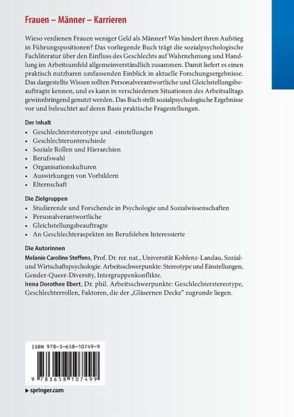 Wieso verdienen Frauen weniger Geld als Männer? Was hindert ihren Aufstieg in Führungspositionen? Das vorliegende Buch trägt die sozialpsychologische Fachliteratur über den Einfluss des Geschlechts auf Wahrnehmung und Handlung im Arbeitsumfeld allgemeinverständlich zusammen. Damit liefert es einen praktisch nutzbaren umfassenden Einblick in aktuelle Forschungsergebnisse. Das dargestellte Wissen sollten Personalverantwortliche und Gleichstellungsbeauftragte kennen, und es kann in verschiedenen Situationen des Arbeitsalltags gewinnbringend genutzt werden. Das Buch stellt sozialpsychologische Ergebnisse vor und beleuchtet auf deren Basis praktische Fragestellungen.