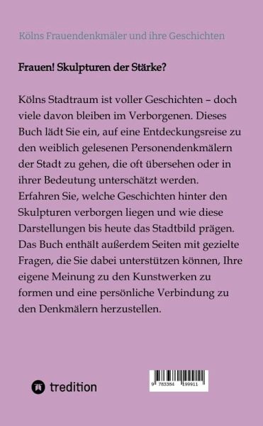 Frauen! Skulpturen der Stärke?Kölns Stadtraum ist voller Geschichten - doch viele davon bleiben im Verborgenen. Dieses Buch lädt Sie ein, auf eine Entdeckungsreise zu den weiblich gelesenen Personendenkmälern der Stadt zu gehen, die oft übersehen oder in ihrer Bedeutung unterschätzt werden.Erfahren Sie, welche Geschichten hinter den Skulpturen verborgen liegen und wie diese Darstellungen bis heute das Stadtbild prägen. Entdecken Sie, warum manche Denkmäler die Zeit überdauern und andere im Schatten der Geschichte verblassen.Das Buch enthält außerdem Malbuch-Seiten und gezielte Fragen, die Sie dabei unterstützen, Ihre eigene Meinung zu den Kunstwerken zu formen und eine persönliche Verbindung zu den Denkmälern herzustellen.