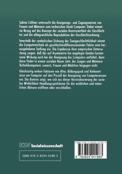 Mein herzlicher Dank gebührt zunächst allen Interview partnerinnen und Interviewpartnem, die mir bereitwillig Auskunft erteilten und ohne die diese Arbeit nicht in der vorliegenden Form hätte entstehen können. Danken möchte ich auch Prof. Dr. Gerald Eberlein, Prof. Dr. Angelika Diezinger, Dr. Ute Kort-Krieger und Dr. Michael Schneider für ihre Unterstützung und Betreuung meiner Arbeit, vor allem durch klärende Gespräche und wertvolle Anregungen. Desweiteren danke ich PD Dr. Christel Schachtner für ihre engagierte Auseinandersetzung und für einschlägige Literaturhinweise. Dr. Peter Hakenesch und Jadwiga Adamiak unterstützten meinen Erkenntnisprozeß in zahlreichen Diskussionen um das Geschlechterverhältnis. Das Manuskript gelesen haben Dr. Heidelore Dillkofer und Dr.Georg-Maria Meyer. Beiden gilt mein besonderer Dank für kompetente Ratschläge und und ihre unermüdliche Unterstützung vor allem in der letzten Phase der Fertigstellung der Arbeit. Sabine Collmer INHALTSVERZEICHNIS 1. Einleitung 11 Gegenstand und Konzeption der Arbeit 1.1 11 1.2 Zum Stand der Forschung 16 Annäherung an das Phänomen Computer: 2.