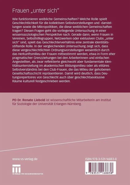 Wie funktionieren weibliche Gemeinschaften? Welche Rolle spielt Geschlechtlichkeit für die kollektiven Selbstvorstellungen und -darstellungen sowie die Mikropolitiken, die diese weiblichen Gemeinschaften tragen? Diesen Fragen geht die vorliegende Untersuchung in einer wissenssoziologischen Perspektive nach. Gerade dann, wenn Frauen in Vereinen, Selbsthilfegruppen, Netzwerken oder exklusiven Clubs "unter sich" sind, spielt das Geschlechterverhältnis eine zentrale identitätsstiftende Rolle. In der vergleichenden Untersuchung zeigt sich, dass diese vergeschlechtlichten Ordnungsvorstellungen wesentlich durch das Herkunftsmilieu der Frauen mitbestimmt werden, etwa in Form eher pragmatischer Grenzziehungen bei den Arbeiterinnen und einfachen Angestellten, als zwar reflektierte gleichwohl aber fundamentale Identitätsunterstellung im akademischen Bildungsmilieu oder als elitäres Selbstverständnis bei den Club-Frauen, die das Milieu der gehobenen Gesellschaftsschicht repräsentieren. Damitwird deutlich, dass Deutungsrepertoires von Geschlecht auch über geschlechtsexklusive Räume kulturell festgeschrieben werden.