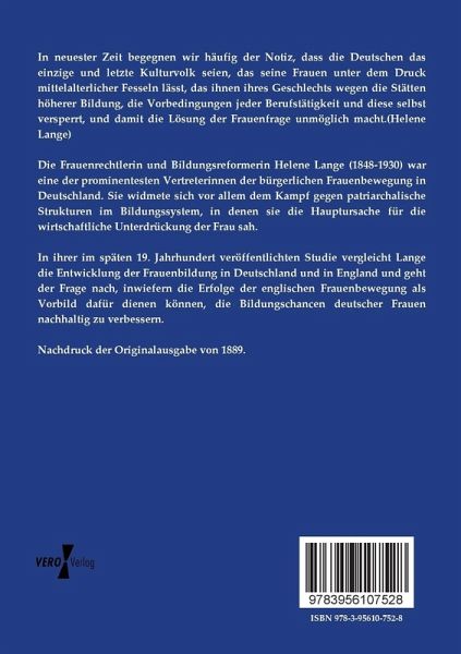 In ihrer im späten 19. Jahrhundert veröffentlichten Studie vergleicht Lange die Entwicklung der Frauenbildung in Deutschland und in England und geht der Frage nach, inwiefern die Erfolge der englischen Frauenbewegung als Vorbild dafür dienen können, die Bildungschancen deutscher Frauen nachhaltig zu verbessern.