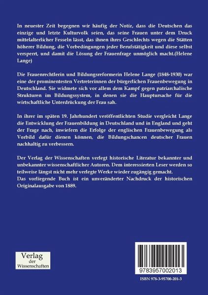 In ihrer im späten 19. Jahrhundert veröffentlichten Studie vergleicht Lange die Entwicklung der Frauenbildung in Deutschland und in England und geht der Frage nach, inwiefern die Erfolge der englischen Frauenbewegung als Vorbild dafür dienen können, die Bildungschancen deutscher Frauen nachhaltig zu verbessern.