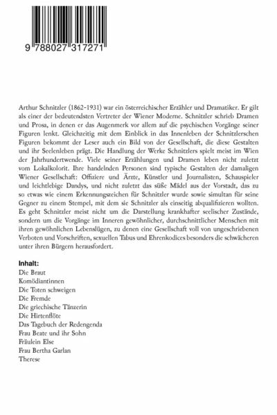 Arthur Schnitzler (1862-1931) war ein österreichischer Erzähler und Dramatiker. Er gilt als einer der bedeutendsten Vertreter der Wiener Moderne. Schnitzler schrieb Dramen und Prosa, in denen er das Augenmerk vor allem auf die psychischen Vorgänge seiner Figuren lenkt. Gleichzeitig mit dem Einblick in das Innenleben der Schnitzlerschen Figuren bekommt der Leser auch ein Bild von der Gesellschaft, die diese Gestalten und ihr Seelenleben prägt. Die Handlung der Werke Schnitzlers spielt meist im Wien der Jahrhundertwende. Viele seiner Erzählungen und Dramen leben nicht zuletzt vom Lokalkolorit. Ihre handelnden Personen sind typische Gestalten der damaligen Wiener Gesellschaft: Offiziere und Ärzte, Künstler und Journalisten, Schauspieler und leichtlebige Dandys, und nicht zuletzt das süße Mädel aus der Vorstadt, das zu so etwas wie einem Erkennungszeichen für Schnitzler wurde sowie simultan für seine Gegner zu einem Stempel, mit dem sie Schnitzler als einseitig abqualifizieren wollten. Es geht Schnitzler meist nicht um die Darstellung krankhafter seelischer Zustände, sondern um die Vorgänge im Inneren gewöhnlicher, durchschnittlicher Menschen mit ihren gewöhnlichen Lebenslügen, zu denen eine Gesellschaft voll von ungeschriebenen Verboten und Vorschriften, sexuellen Tabus und Ehrenkodices besonders die schwächeren unter ihren Bürgern herausfordert. Inhalt: - Die Braut - Komödiantinnen - Die Toten schweigen - Die Fremde - Die griechische Tänzerin - Die Hirtenflöte - Das Tagebuch der Redengenda - Frau Beate und ihr Sohn - Fräulein Else - Frau Bertha Garlan - Therese