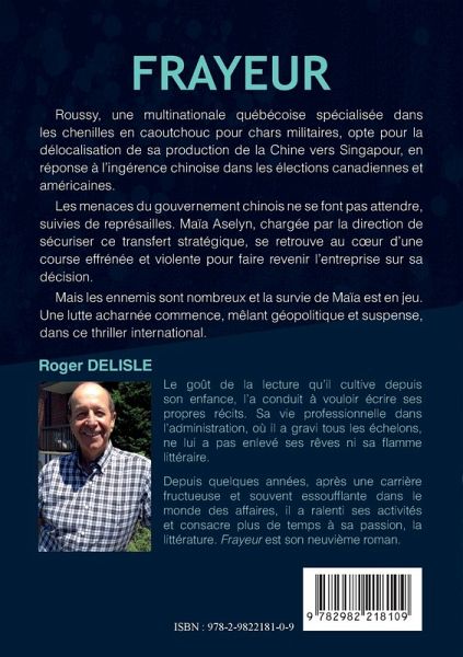 FrayeurUne enquête de Maïa Aselyn Roussy, une multinationale québécoise spécialisée dans les chenilles en caoutchouc pour chars militaires, opte pour la délocalisation de sa production de la Chine vers Singapour, en réponse à l'ingérence chinoise dans les élections canadiennes et américaines. Les menaces du gouvernement chinois ne se font pas attendre, suivies de représailles. Maïa Aselyn, chargée par la direction de sécuriser ce transfert stratégique, se retrouve au c¿ur d'une course effrénée et violente pour faire revenir l'entreprise sur sa décision.Mais les ennemis sont nombreux et la survie de Maïa est en jeu. Une lutte acharnée commence, mêlant géopolitique et suspense, dans ce thriller international. Il est possible de retrouver Maïa Aselyn, dans les titres suivants : Ranc¿ur (2020)Contrecoups (2015)La Saga oubliée (2009)