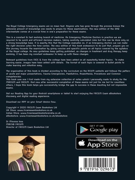 A new updated edition of the FRCEM Intermediate SAQ. This 2020 edition of the revised material has been updated to include new and revised guidelines, correct typographical errors and reference all chapters as recommended by readers. It replaces the 2019 edition. The Royal University Emergency examinations are no easy task. Anyone who has been through the process knows the extensive knowledge one needs to accumulate for these exams. The new edition of SAQ intermediate comes at a crucial time in preparation for these exams. This is a constantly and rapidly evolving branch of medicine. Emergency medicine practitioners need to make quick and efficient decisions and take carefully calculated risks, but this can only be done with a solid knowledge base. And that is precisely what the University emphasises: whether we, as emergency physicians, can make the right decision when it matters. The new edition of this book seeks to do just that, to prepare you on that journey to the exam by providing concise and specific points on all the topics covered in the Royal University syllabus. With new guidelines being published all the time and treatment and drug therapy constantly evolving, it has been my constant endeavour to keep up with these changes. Volume 1 contains:Section I: Acute & Major Presentations Section II: Ultrasound Volume 2 Contains:Section III: Trauma Presentations Section IV: Paediatric Presentations Section V: Anaesthetic Competences Section VI: Procedure Competences Section VII: Common Competences