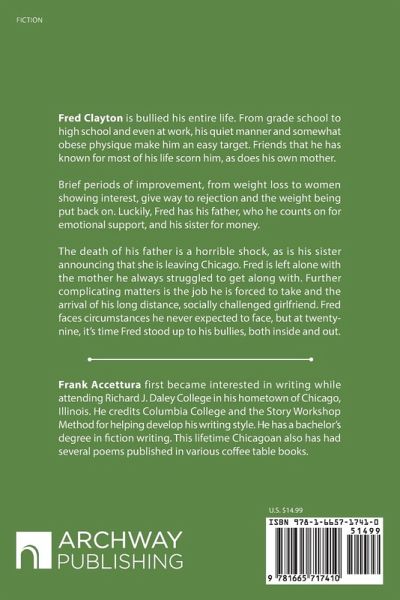 Fred Clayton is bullied his entire life. From grade school to high school and even at work, his quiet manner and somewhat obese physique make him an easy target. Friends that he has known for most of his life scorn him, as does his own mother. Brief periods of improvement, from weight loss to women showing interest, give way to rejection and the weight being put back on. Luckily, Fred has his father, who he counts on for emotional support, and his sister for money. The death of his father is a horrible shock, as is his sister announcing that she is leaving Chicago. Fred is left alone with the mother he always struggled to get along with. Further complicating matters is the job he is forced to take and the arrival of his long distance, socially challenged girlfriend. Fred faces circumstances he never expected to face, but at twenty-nine, it's time Fred stood up to his bullies, both inside and out.