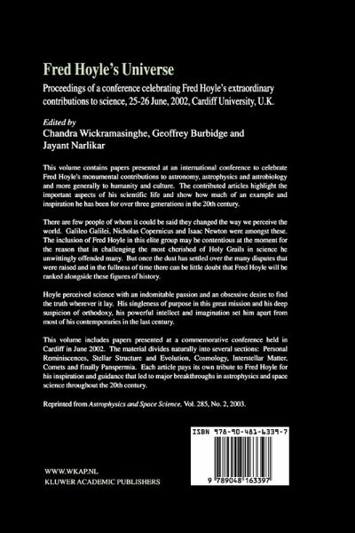 Fred Hoyle's Universe, edited by C. Wickramasinghe, G. Burbridge and J. Narlikar. ISBN 1-4020-1415-5 'This book is a joy to have. It is a marvelous tribute to the life and achievements of Fred Hoyle, written by those who knew him first hand, wether as wartime colleagues, research students, or employees.' (Simon Mitton) A&G vol. 45, 2004