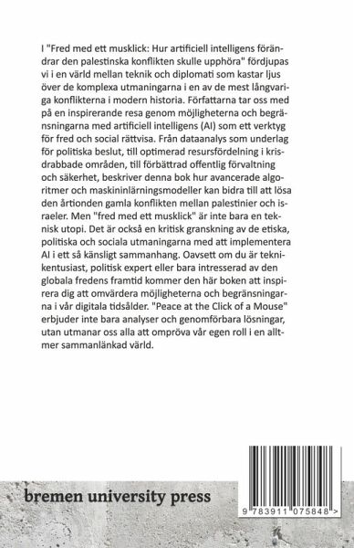 I "Fred med ett musklick: Hur artificiell intelligens förändrar den palestinska konflikten skulle upphöra" fördjupas vi i en värld mellan teknik och diplomati som kastar ljus över de komplexa utmaningarna i en av de mest långvariga konflikterna i modern historia. Författarna tar oss med på en inspirerande resa genom möjligheterna och begränsningarna med artificiell intelligens (AI) som ett verktyg för fred och social rättvisa. Från dataanalys som underlag för politiska beslut, till optimerad resursfördelning i krisdrabbade områden, till förbättrad offentlig förvaltning och säkerhet, beskriver denna bok hur avancerade algoritmer och maskininlärningsmodeller kan bidra till att lösa den årtionden gamla konflikten mellan palestinier och israeler. Men "fred med ett musklick" är inte bara en teknisk utopi. Det är också en kritisk granskning av de etiska, politiska och sociala utmaningarna med att implementera AI i ett så känsligt sammanhang. Oavsett om du är teknikentusiast, politisk expert eller bara intresserad av den globala fredens framtid kommer den här boken att inspirera dig att omvärdera möjligheterna och begränsningarna i vår digitala tidsålder. "Peace at the Click of a Mouse" erbjuder inte bara analyser och genomförbara lösningar, utan utmanar oss alla att ompröva vår egen roll i en alltmer sammanlänkad värld.