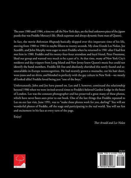 The years 1980 until 1984, a time we call the New York days, are the final unknown piece of the jigsaw puzzle that was Freddie Mercury's life. (Rock superstar and always dynamic front man of Queen). In fact, the movie Bohemian Rhapsody basically skipped over this important time of his life, moving from 1980 to 1984 in maybe fifteen to twenty seconds. My close friends Lee Nolan, Joe Scardilli, and John Murphy were eager to meet Freddie when he returned in 1981 after I had first met him in 1980. Freddie and his twenty-four-hour attendant and loyal friend, Peter Freestone, liked our group and wanted very much to be a part of it. At that time, many of New York City's residents and day-trippers from Long Island and New Jersey knew Queen's music but could not identify the band members. Freddie felt free and absolutely cherished this newly found and so-unavailable-in-Europe nonrecognition. He had recently grown a mustache, cut his hair short, wore jeans and tee shirts, and blended in perfectly with the gay culture in New York--we mostly all looked alike! Freddie loved being just "one of the boys." Unfortunately, John and Joe have passed on. Lee and I, however, continued the relationship beyond 1986 when we were invited several times to Freddie's beloved Garden Lodge in the heart of London. Lee was the constant photographer and has preserved a great many of these photos, which have never been seen prior to our book. One of the last things that Freddie repeated to Lee on our last visit, June 1991, was to "make these photos work for you, darling!" You will see wonderful photos of Freddie, off the stage and participating in the real world. You will see fun and excitement in his face at every turn of the page. Enjoy! Thor Arnold and Lee Nolan