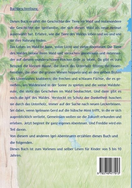 Titel: Freddies AbenteuerUntertitel: Mimi und Gerd Band 1 BuchbeschreibungDieses Buch erzählt die Geschichte der Tiere im Wald und insbesondere die Geschichte der Igelfamilie, die sich diesen Wald als neue Heimat auserwählt hat. Erfahre, wie die Tiere des Waldes leben und wo und wie sie ihre Nah-rung finden. Das Leben im Wald ist bunt, voller Licht und vieler Abenteuer. Die Tiere des Waldes lieben ihren Wald und versuchen gemeinsam und miteinander auf diesem wunderschönen Flecken Erde zu leben. Da gibt es zum Beispiel die kleinen Mäuse, die durch das Unterholz flitzen; die Hasenfamilien, die über die grünen Wiesen hoppeln und an den gelben Blüten des Löwenzahns knabbern; die frechen und schlauen Füchse, die es genießen, am Waldes-rand in der Sonne zu spielen und die weise Waldohreule, die stets das Ge-schehen im Wald beobachtet. Und dann gibt es noch die Igel des Waldes. Versteckt im Schutz der Dunkelheit huschen sie durch das Unterholz, immer auf der Suche nach neuen Leckerbissen. Sei dabei, wenn Igelmann Gerd auf die hübsche Mimi trifft, in die er sich augenblicklich verliebt. Gemeinsam wollen sie die Zukunft erkunden und erleben. Jetzt beginnt ihr ganz eigenes Abenteuer. Und Freddie wird ein Teil davon. Von diesem und anderen Igel-Abenteuern erzählt dieses Buch und die folgenden. Dieses Buch ist zum Vorlesen und selber Lesen für Kinder von 5 bis 10 Jahren.