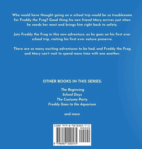 Who would have thought going on a school trip would be so troublesome for Freddy the Frog? Good thing his new friend Mary arrives just when he needs her most and brings him right back to safety. Join Freddy the Frog in this new adventure, as he goes on his first ever school trip, visiting his first ever nature preserve. There are so many exciting adventures to be had, and Freddy the Frog and Mary can't wait to spend more time with one another. OTHER BOOKS IN THIS SERIES: The Beginning School Days The Costume Party Freddy Goes to the Aquarium and more