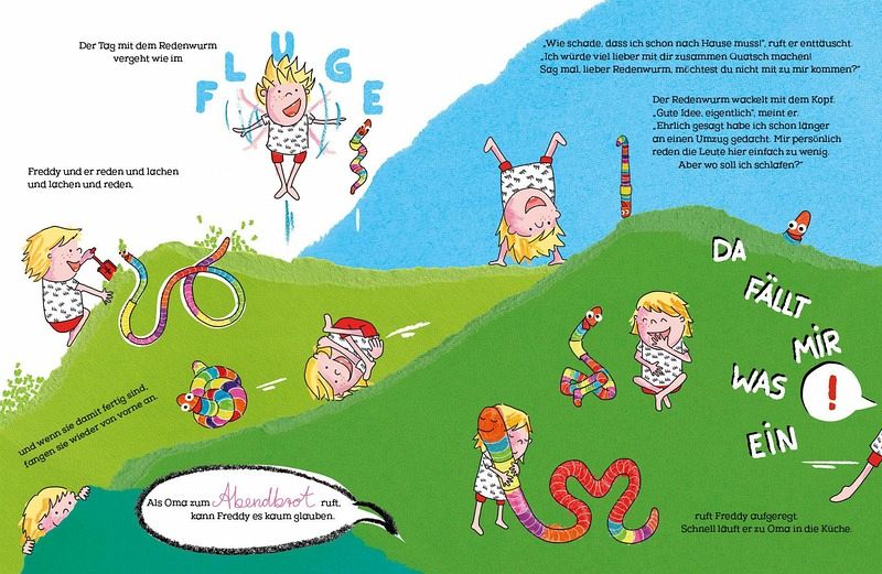 Doch was ist das? Als Freddy sich beschwert und in eine Ecke des Gartens zurückzieht, antwortet ihm jemand! Aber wer? Doch nicht etwa dieser kleine freche Redenwurm? Das wäre ja ein Ding! Und so erlebt Freddy einen sehr überraschenden Nachmittag bei den Großeltern und wünscht sich vielleicht am Ende doch keinen Papagei mehr als Haustier.