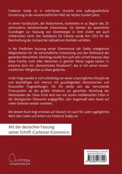Der englische Chemieprofessor und Nobelpreisträger des Jahres 1921, Frederick Soddy, kann als einer der wichtigsten Vordenker der heutigen Ökologischen Ökonomie angesehen werden. Sein Lebensweg weist ihn als eine vielseitig interessierte Persönlichkeit aus und er ist damit prädestiniert, ihn als einen ¿Wanderer zwischen den Welten der Wissenschaften¿ zu charakterisieren. Mit vier Büchern, zwischen 1921 und 1934 geschrieben, setzt Soddy eine idealistisch anmutende Kampagne zur radikalen Umformung der globalen Finanzbeziehungen in Gang und entwickelt eine neue Sichtweise auf die Wirtschaft, welche aus physikalischen Gesetzmäßigkeiten begründet wird ¿ insbesondere aus den Gesetzen der Thermodynamik.
