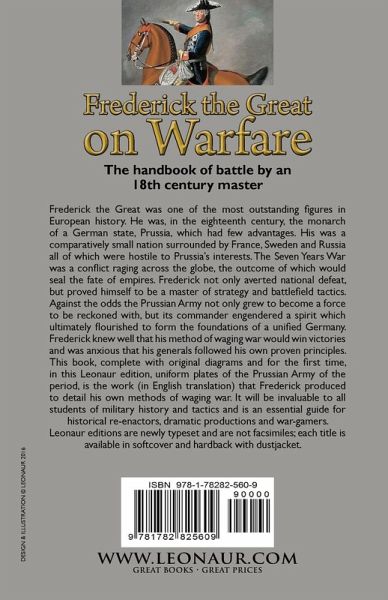 The handbook of battle by an 18th century master Frederick the Great was one of the most outstanding figures in European history. He was, in the eighteenth century, the monarch of a German state, Prussia, which had few advantages. His was a comparatively small nation surrounded by France, Sweden and Russia all of which were hostile to Prussia’s interests. The Seven Years War was a conflict raging across the globe, the outcome of which would seal the fate of empires. Frederick not only averted national defeat, but proved himself to be a master of strategy and battlefield tactics. Against the odds the Prussian Army not only grew to become a force to be reckoned with, but its commander engendered a spirit which ultimately flourished to form the foundations of a unified Germany. Frederick knew well that his method of waging war would win victories and was anxious that his generals followed his own proven principles. This book, complete with original diagrams and for the first time, in this Leonaur edition, uniform plates of the Prussian Army of the period, is the work (in English translation) that Frederick produced to detail his own methods of waging war. It will be invaluable to all students of military history and tactics and is an essential guide for historical re-enactors, dramatic productions and war-gamers. Leonaur editions are newly typeset and are not facsimiles; each title is available in softcover and hardback with dustjacket.