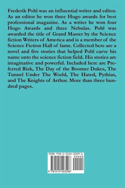 Frederik Pohl was an influential writer and editor. As an editor he won three Hugo awards for best professional magazine. As a writer he won four Hugo Awards and three Nebulas. Pohl was awarded the title of Grand Master by the Science fiction Writers of America and is a member of the Science Fiction Hall of fame. Collected here are a novel and five stories that helped Pohl carve his name onto the science fiction field. His stories are imaginative and powerful. Included here arePreferred Risk The Day of the Boomer Dukes The Tunnel Under The World The Hated Pythias, The Knights of Arthur More than three hundred pages. If you enjoyed this book, you'll want to search on "Positronic Publishing Super Pack" and check out all our other Super Packs!