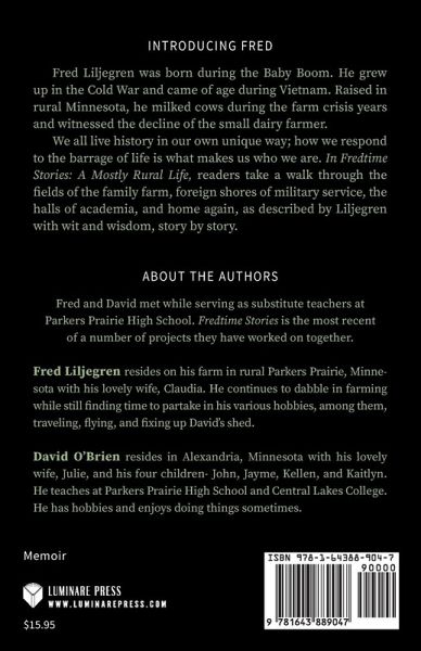 Fred Liljegren was born during the Baby Boom. He grew up in the Cold War and came of age during Vietnam. Raised in rural Minnesota, he milked cows during the farm crisis years and witnessed the decline of the small dairy farmer. We all live history in our own unique way; how we respond to the barrage of life is what makes us who we are. In Fredtime Stories: A Mostly Rural Life, readers take a walk through the fields of the family farm, foreign shores of military service, the halls of academia, and home again, as described by Liljegren with wit and wisdom, story by story. ¿ Fred and David met while serving as substitute teachers at Parkers Prairie High School. Fredtime Stories is the most recent of a number of projects they have worked on together.