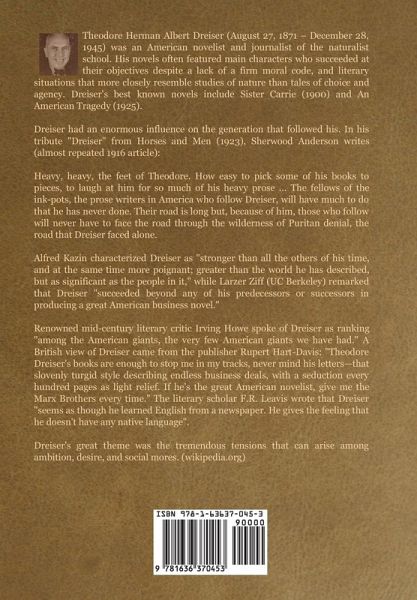 Theodore Herman Albert Dreiser (August 27, 1871 - December 28, 1945) was an American novelist and journalist of the naturalist school. His novels often featured main characters who succeeded at their objectives despite a lack of a firm moral code, and literary situations that more closely resemble studies of nature than tales of choice and agency. Dreiser's best known novels include Sister Carrie (1900) and An American Tragedy (1925). Dreiser had an enormous influence on the generation that followed his. In his tribute "Dreiser" from Horses and Men (1923), Sherwood Anderson writes (almost repeated 1916 article): Heavy, heavy, the feet of Theodore. How easy to pick some of his books to pieces, to laugh at him for so much of his heavy prose ... The fellows of the ink-pots, the prose writers in America who follow Dreiser, will have much to do that he has never done. Their road is long but, because of him, those who follow will never have to face the road through the wilderness of Puritan denial, the road that Dreiser faced alone. Alfred Kazin characterized Dreiser as "stronger than all the others of his time, and at the same time more poignant; greater than the world he has described, but as significant as the people in it," while Larzer Ziff (UC Berkeley) remarked that Dreiser "succeeded beyond any of his predecessors or successors in producing a great American business novel." Renowned mid-century literary critic Irving Howe spoke of Dreiser as ranking "among the American giants, the very few American giants we have had." A British view of Dreiser came from the publisher Rupert Hart-Davis: "Theodore Dreiser's books are enough to stop me in my tracks, never mind his letters--that slovenly turgid style describing endless business deals, with a seduction every hundred pages as light relief. If he's the great American novelist, give me the Marx Brothers every time." The literary scholar F.R. Leavis wrote that Dreiser "seems as though he learned English from a newspaper. He gives the feeling that he doesn't have any native language". Dreiser's great theme was the tremendous tensions that can arise among ambition, desire, and social mores. (wikipedia.org)