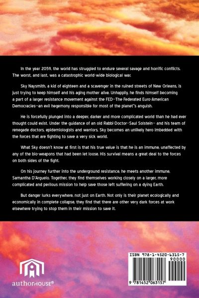 In the year 2059, the world has undergone several different conflicts, the worst of which was a catastrophic, global biological war. In this war, almost a third of humanity was killed by tailored, weaponized viruses. Almost all companion animals were destroyed and at least two thirds of protein animals were affected in ways unexpected or killed off completely. Sky Naysmith, a kid of eighteen and a scavenger in the ruined streets of New Orleans, is just trying to keep himself and his aging mother alive. Unhappily, he finds himself becoming a part of a larger resistance movement against the FED--The Federated Euro-American Democracies--an evil hegemony responsible for most of the planet''s anguish. He is forcefully plunged into a deeper, darker and more complicated world than he had ever thought could exist. Under the guidance of an old Rabbi-Doctor--Saul Solstein-- and his team of renegade doctors, epidemiologists and warriors, Sky becomes an unlikely hero imbedded with the forces that are fighting to save a very sick world. What Sky doesn't know at first is that his true value is that he is an immune, unaffected by any of the bio-weapons that had been let loose. His survival means a great deal to the forces on both sides of the fight. On his journey further into the underground resistance, he meets another immune, Samantha D'Arguelo. Together, they find themselves working closely on a larger, more complicated and perilous mission to help save those left suffering on a dying Earth. But danger lurks everywhere, not just on Earth. Not only is their planet ecologically and economically near complete collapse, there are other very dark forces at work elsewhere that are trying to thwart them and their compatriots in their mission.