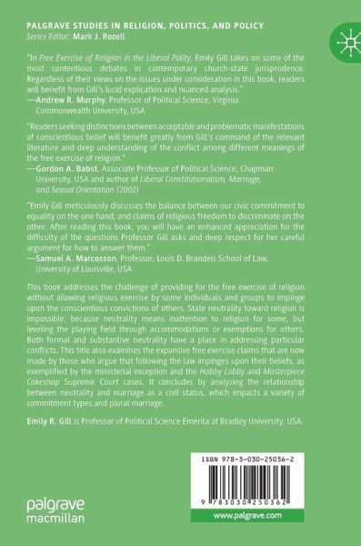 This book addresses the challenge of providing for the free exercise of religion without allowing religious exercise by some individuals and groups to impinge upon the conscientious convictions of others. State neutrality toward religion is impossible, because neutrality means inattention to religion for some, but leveling the playing field through accommodations or exemptions for others. Both formal and substantive neutrality have a place in addressing particular conflicts. One such example is public funding for religiously affiliated social service programs, for which neither type of neutrality is satisfactory and thus some restrictions are justifiable; conversely, private voluntary organizations that do not receive direct public funding should be allowed wide latitude regarding their practices. This title also examines the expansive free exercise claims that are now made by those who argue that following the law impinges upon their beliefs, as exemplified by the ministerial exception and the Hobby Lobby and Masterpiece Cakeshop Supreme Court cases. It concludes by analyzing the relationship between neutrality and marriage as a civil status, which impacts a variety of commitment types and plural marriage.