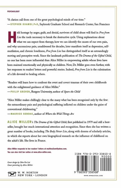 Since the landmark publication of The Drama of the Gifted Child, no one has been more influential than Alice Miller in empowering adults whose lives were maimed emotionally and physically as children. Now Dr. Miller goes even further, presenting groundbreaking theories that enhance communication between therapist and patient and enable the adult to express powerful emotions that have been trapped for years. Practical and perceptive, Miller's work explains what we can expect from therapy, how we can identify the causes of our own pain, and why subconscious pain, unaddressed for decades, manifests itself later as depression, self-mutilation, primal inadequacy, and chronic loneliness. With its responses to readers' letters and powerful stories, Free from Lies is the culmination of a life devoted to healing others.