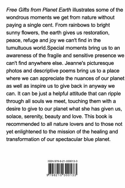 Free Gifts from Planet Earth illustrates some of the wondrous moments we get from nature without paying a single cent. From rainbows to bright sunny flowers, the earth gives us restoration, peace, refuge and joy we can't find in the tumultuous world. Special moments bring us to an awareness of the fragile and sensitive presence we can't find anywhere else. Jeanne's picturesque photos and descriptive poems bring us to a place where we can appreciate the nuances of our planet as well as inspire us to give back in any way we can. It can be just a helpful attitude that can ripple through all souls we meet, touching them with a desire to give to our planet what she has given us, solace, serenity, beauty and love. This book is recommended to all nature lovers and to those not yet enlightened to the mission of the healing and transformation of our spectacular blue planet.,