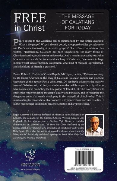 Paul’s epistle to the Galatians can be summarized by one simple question: What is the gospel? What is the real gospel, as opposed to false gospels or (to use Paul’s own terminology) perverted gospels? One recent commentator has written, "Historically, Galatians has been foundational for many forms of Christian doctrine, proclamation and practice. And it remains true today to say that how one understands the issues and teaching of Galatians, determines in large measure what kind of theology is espoused, what kind of message is proclaimed, and which kind of lifestyle is practiced." Pastor Robert L. Dickie, of Grand Rapids, Michigan, writes, "This commentary by Dr. Edgar Andrews on the book of Galatians is a clear, concise and practical exposition of the apostle Paul’s great letter. Dr. Andrews addresses the massive issue of Galatians with a clarity and relevance that will be appreciated by all who have an interest in promoting the true gospel of Jesus Christ. This timely book will enable the reader to define the gospel clearly and biblically, and to recognize the dangerous errors and trends developing in the evangelical church today. This is must reading for those whose chief concern is to preach Christ and him crucified. I highly recommend this book to preachers, pastors and lay people alike."