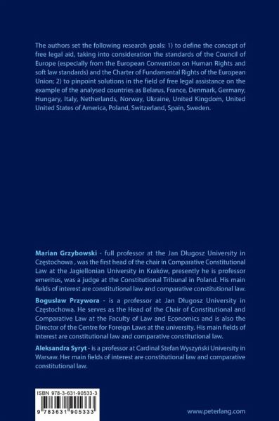 Jerzy Jaskiernia: Free Legal Aid in the Axiological System of the Council of Europe - Agnieszka Franczak, Boguslaw Przywora: International and EU Standards for the Protection of Taxpayers' Rights and the Formalized System of Pre-Trial Free Legal Aid in Poland: An Approach to Analysis - Michal Bozek: Free Legal Aid in the Federal Republic of Germany - Grzegorz Krawiec: The System of Free Legal Aid in the Netherlands - Boguslaw Przywora, Aleksander Wróbel: The System of Free Legal Aid in the Kingdom of Sweden - Marcin Grzybowski, Marian Grzybowski: Free Legal Aid in Denmark and Norway - Ksenia Kakareko: Legal Aid in the Republic of Belarus - Dávid Tóth: Legal Aid and Cooperation in Criminal Matters in Hungary - Marta Osuchowska: Free Legal Aid in Spain - Dorota Kottmann, Grazyna Szpor: Access to Information About Law in Switzerland - Beata Nuzzo: The System of Free Legal Aid in the Italian Republic - Malgorzata Augustyniak: Forms of Free Legal Aid in France - Maria Kalinowska: Free Legal Aid in the United Kingdom - Maria Kalinowska: Free Legal Aid in the United States of America - Ivan Pankevych: Free Legal Aid in Ukraine - Ilnytskyi Oleh: University Legal Clinic in Ukraine - Agnieszka Gloria Kaminska: Navigating Equitable Horizons: The Evolution and Prospects of Legal Aid in the Republic of Malta - Agnieszka Piskorz- Ryn: Access to Information on the Law from the Perspective of the Access to Public Information Act - Authors