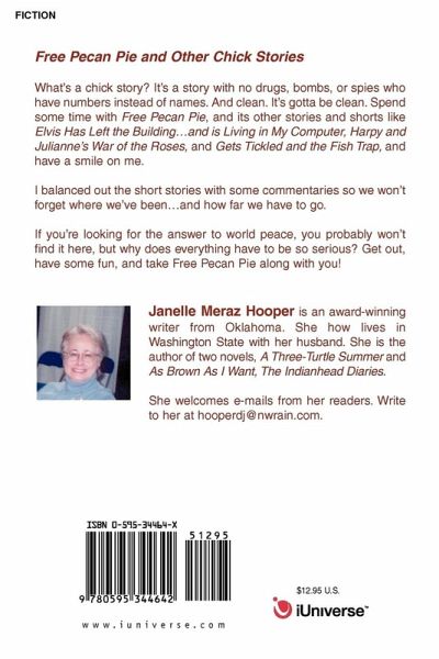 Free Pecan Pie and Other Chick Stories What's a chick story? It's a story with no drugs, bombs, or spies who have numbers instead of names. And clean. It's gotta be clean. Spend some time with Free Pecan Pie, and its other stories and shorts like Elvis Has Left the Building...and is Living in My Computer, Harpy and Julianne's War of the Roses, and Gets Tickled and the Fish Trap, and have a smile on me. I balanced out the short stories with some commentaries so we won't forget where we've been...and how far we have to go. If you're looking for the answer to world peace, you probably won't find it here, but why does everything have to be so serious? Get out, have some fun, and take Free Pecan Pie along with you!